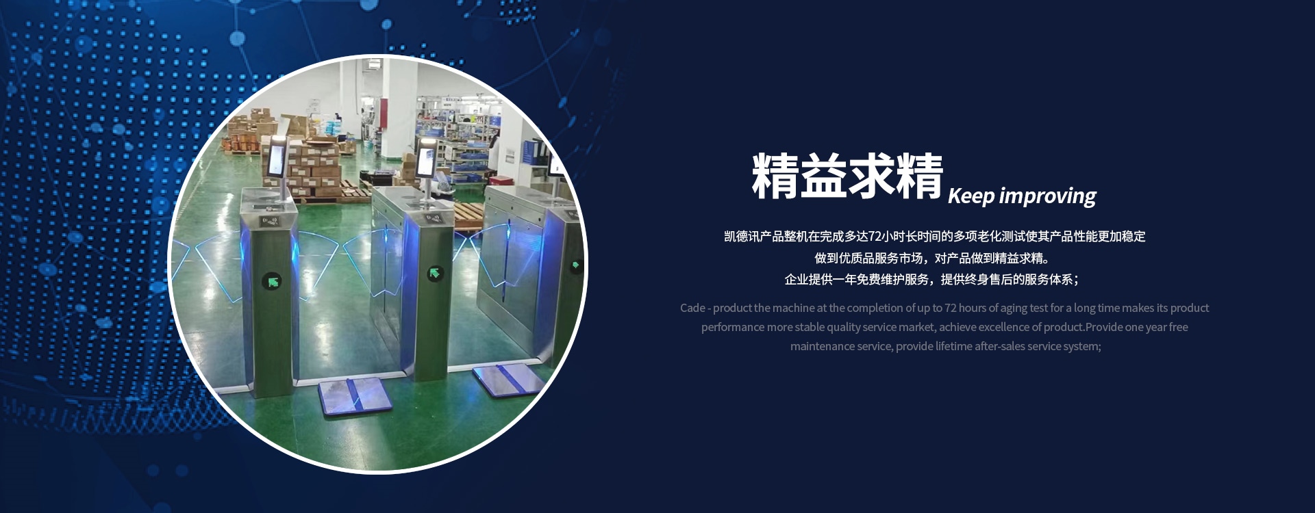 深圳市凱德訊科技有限公司成立于2003年,注冊資本500萬元,位于港珠澳大灣區的深圳市,公司集研發(fā)、生產、銷售電子行業(yè)防靜電門禁系統和民用智能通道系統的綜合性企業(yè)。公司擁有自主產權的產品并一直致力于ESD門禁系統、智能安防門禁系統、景區通道閘機、人臉識別閘機、消費系統、智能翼閘的研發(fā)生產與銷售。凱德訊目前擁有多款功能齊全的系統軟件及多款硬件產品,包含成型加工、機芯研發(fā)、軟件開發(fā)等技術均為本公司自主研發(fā)、獨立完成。14年來,凱德訊一直秉承以用戶需求為核心,穩(wěn)定、實用、智能的產品是我們開拓市場的基石,務實進取的精神是我們孜孜不倦的追求,全方位真誠的服務是我們對您永恒的承諾。